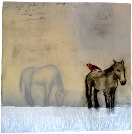 Red Bird with Horses, 2011, Encaustic, oil on panel, 16" x 16"