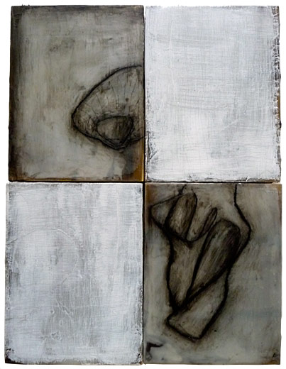 Shells and Fossils, 2011, Encaustic, oil on four panels, 12" x 16" (polyptych)