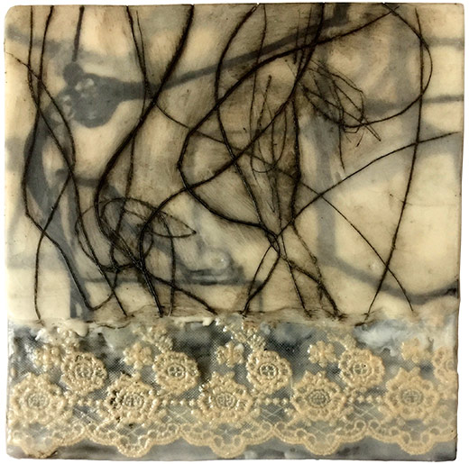 Lace with Black, 2018, Encaustic, oil, ink on panel, 10" x 10" x 2"