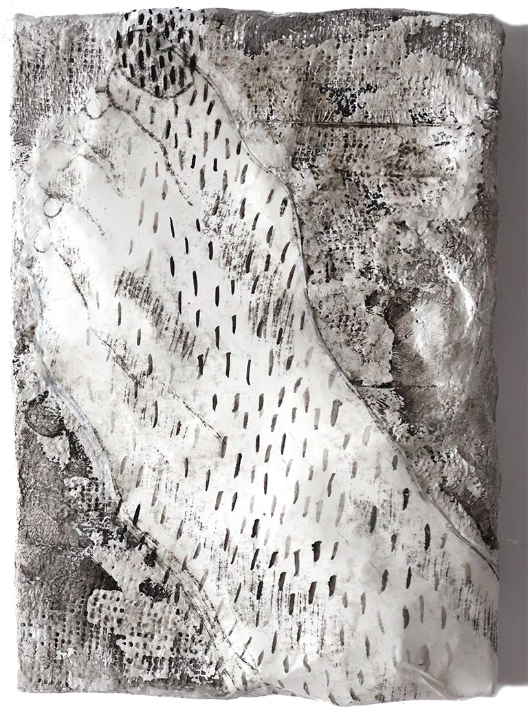 Complex Terrain, 2022, Plaster cloth, gouache, intaglio ink, paper on wood, 7.5" x 5.5" x 1"