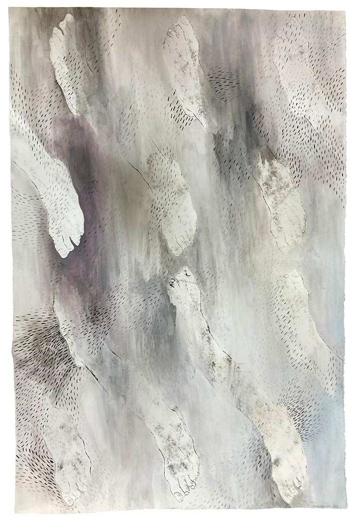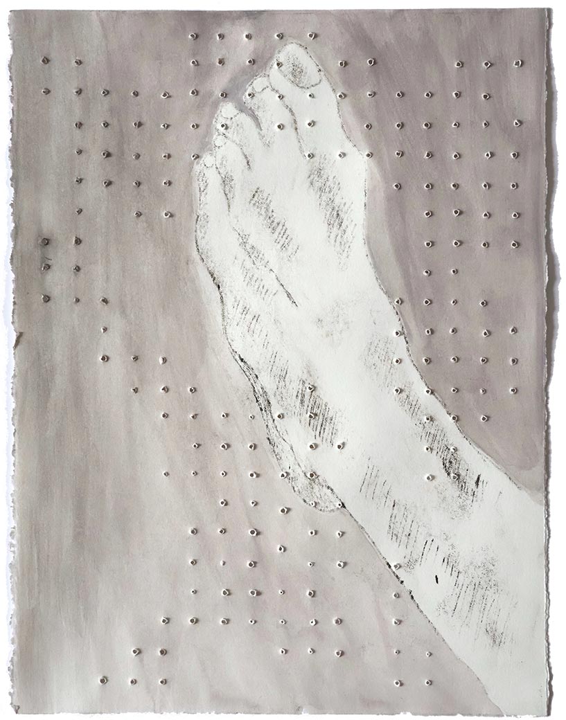 Small Foot with Holes, 2022, Gouache, intaglio ink on paper, 12" x 9"