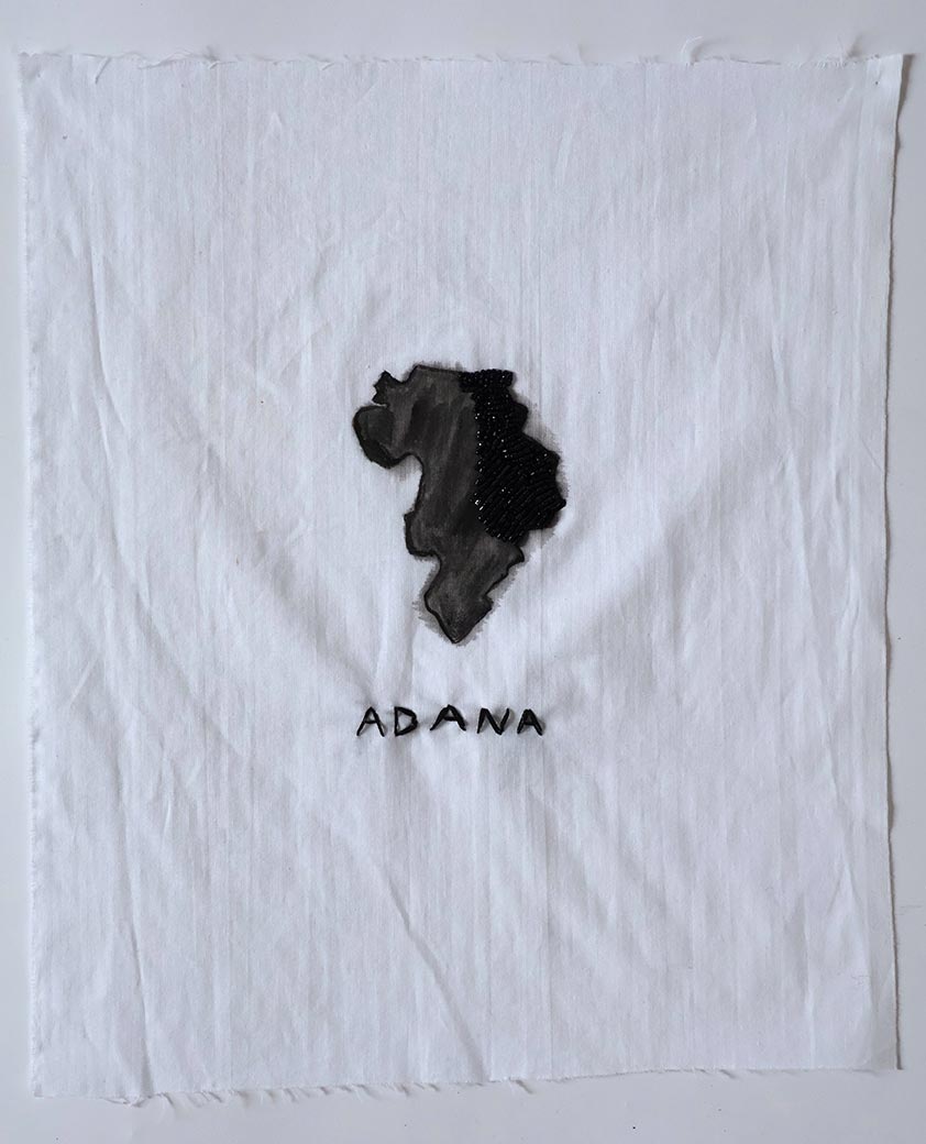Lost Places (Adana), 2022, Series of small works on cotton, with thread, acrylic paint, ink, and beads, approx 14" x 11"
