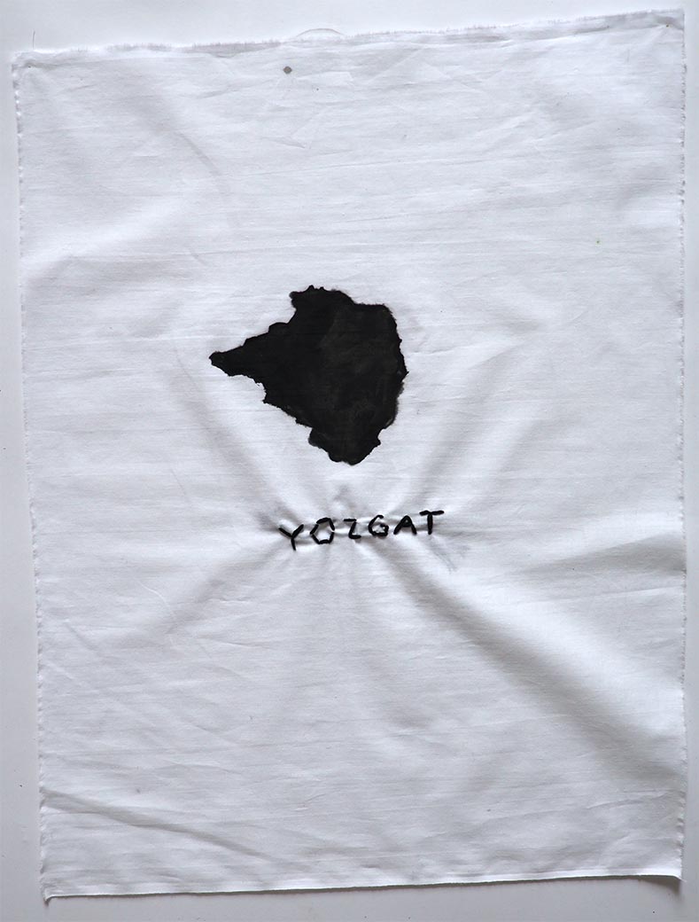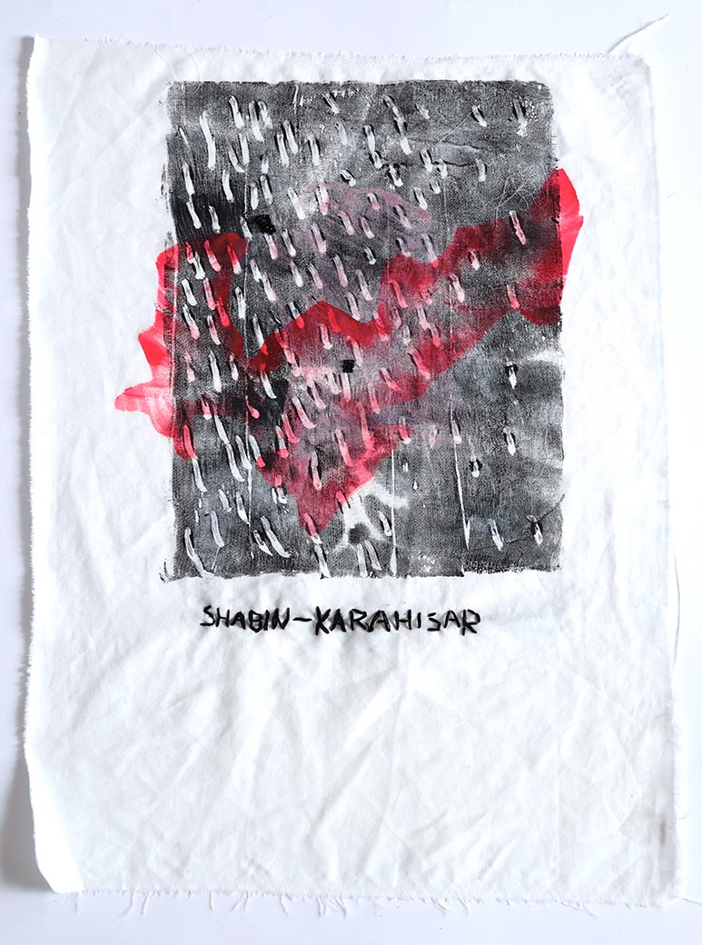 Lost Places (Shabin-Karahisar), 2022, Series of small works on cotton, with thread, acrylic paint, ink, and beads, approx. 14" x 11"