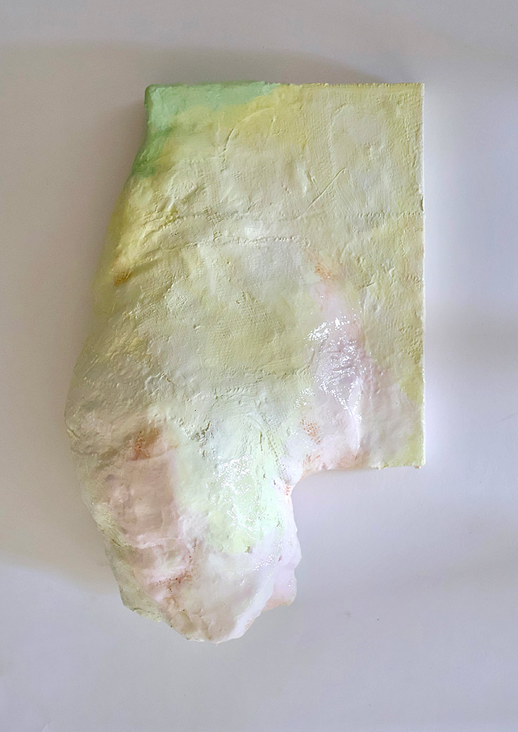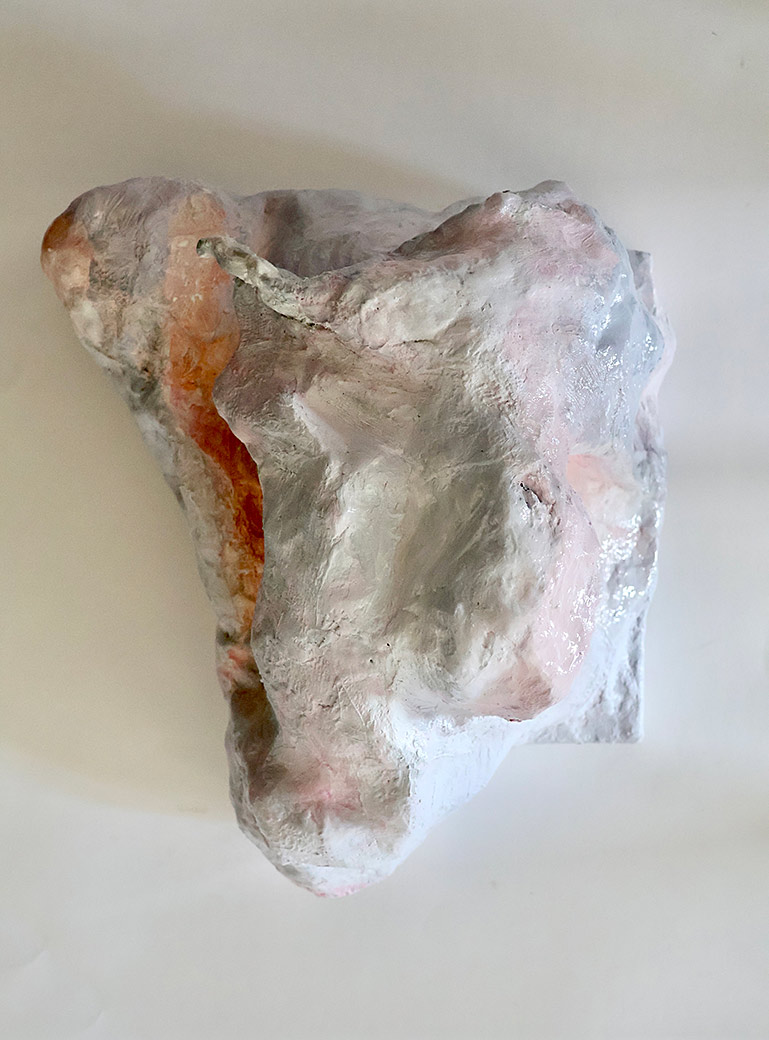 Inside Outside, 2025, Plaster, paper, wood, acrylic, gloss medium, 11" x 9" x 6"