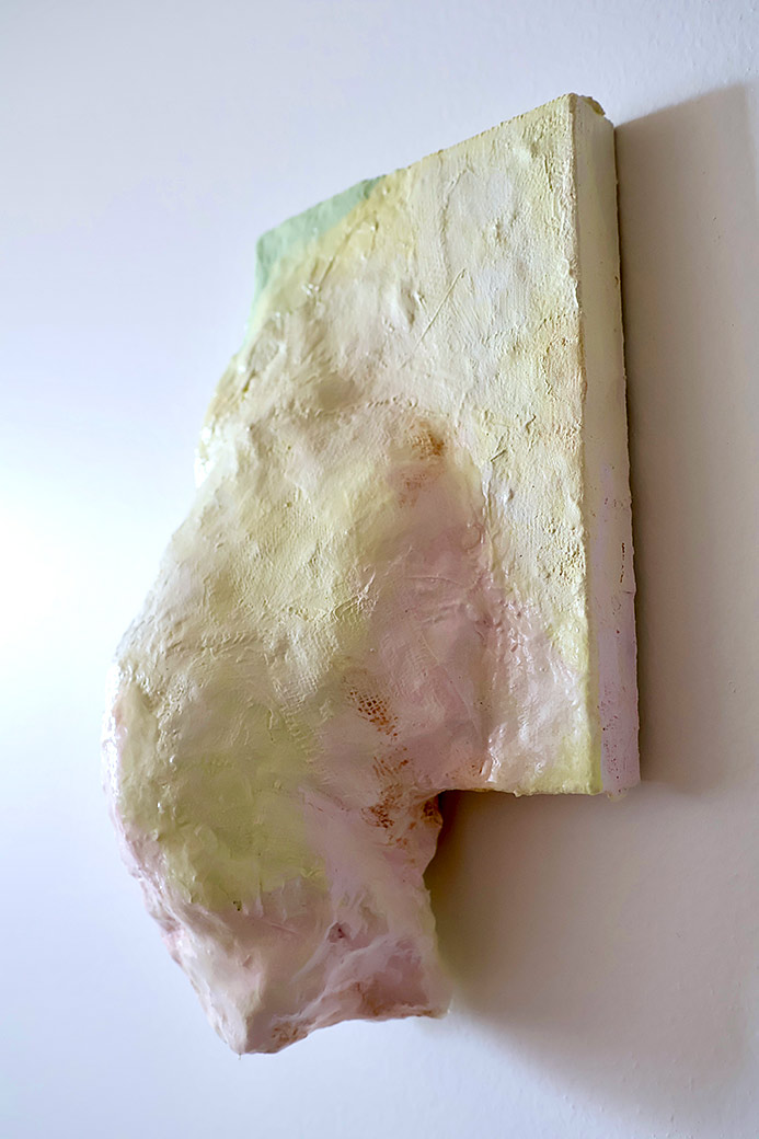 Yellow Arm (detail), 2025, Plaster, paper, wood, acrylic, gloss medium, 11" x 7" x 4"